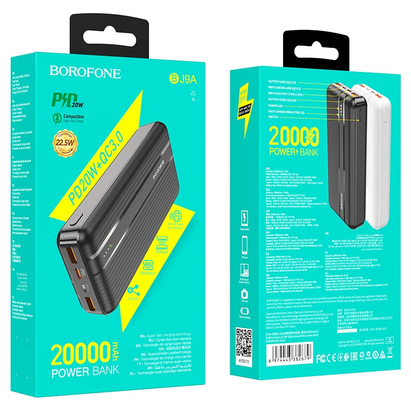 Borofone BJ9A Uranus 20000mAh Black | Powerbank | Power bank, 2x USB, 1x USB-C, PD QC 3.0 22,5W