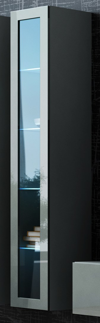 Glazed front, Handle-free fronts, Self-assembly furniture, Laminated chipboard is resistant to mechanical stress and extreme temperatures, Wall cabinet, Available backlight colours: cold white, red, blue, green, Four shelves inside, Optional LED lighting for shelves (extra charge), The photos of the sets show an example arrangement with other furniture from the collection. The remaining models are available for sale separately., It is possible to buy LED cabinet lighting. |