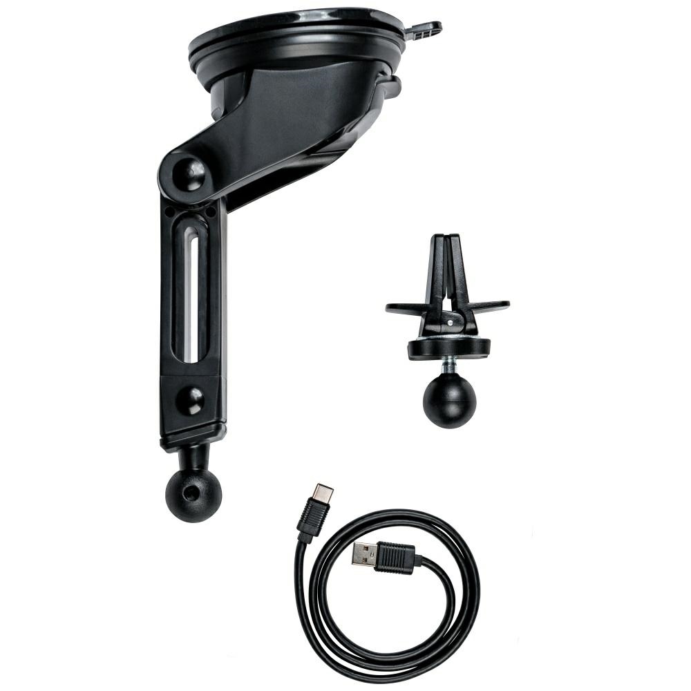 Charger, USB-C to USB-A cable, vent mount, suction cup mount, manual