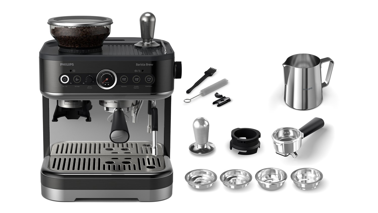 | Portafilter; 4x filter baskets; Milk jug; Tamper; Cleaning brushes & pin; Powder Ring |