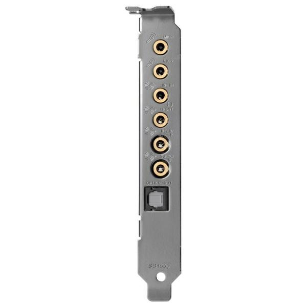 | Input options | PC – PCI-e x1 Main input options: Optical output: 1 x TOSLINK Line-in: 1 x 3.5 mm jack connector Microphone input: 2 x 3.5 mm jack connectors Line output: 1 x 3.5 mm jack connector (Front speakers) 1 x 3.5 mm jack connector (Rear/Right side) 1 x 3.5 mm jack connector (Center/Sub/Left side) Headphone output: 1 x 3.5 mm jack connector shared with front speaker output |