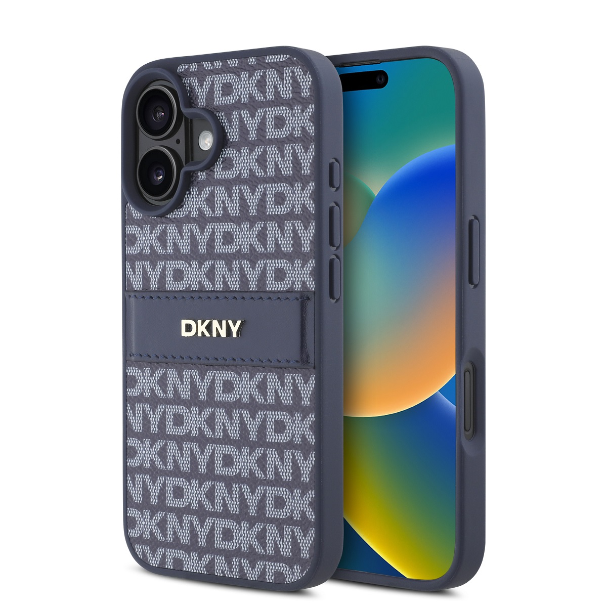 Design krytu telefonu má elegantní, moderní estetiku s opakujícím se vzorem loga „DKNY” po celé zadní straně a výrazným pruhem s nepřehlédnutelným ikonickým logem.