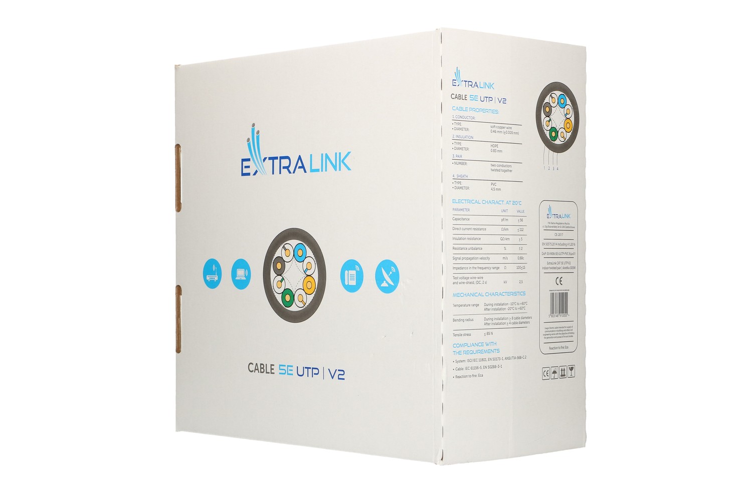 The Extralink CAT 5E UTP (U/UTP) V2 cable is designed for indoor use, and is ideal for building networks in offices. UTP cable is often used in CCTV installations where one cable can transmit video signal from several cameras and power supply.
