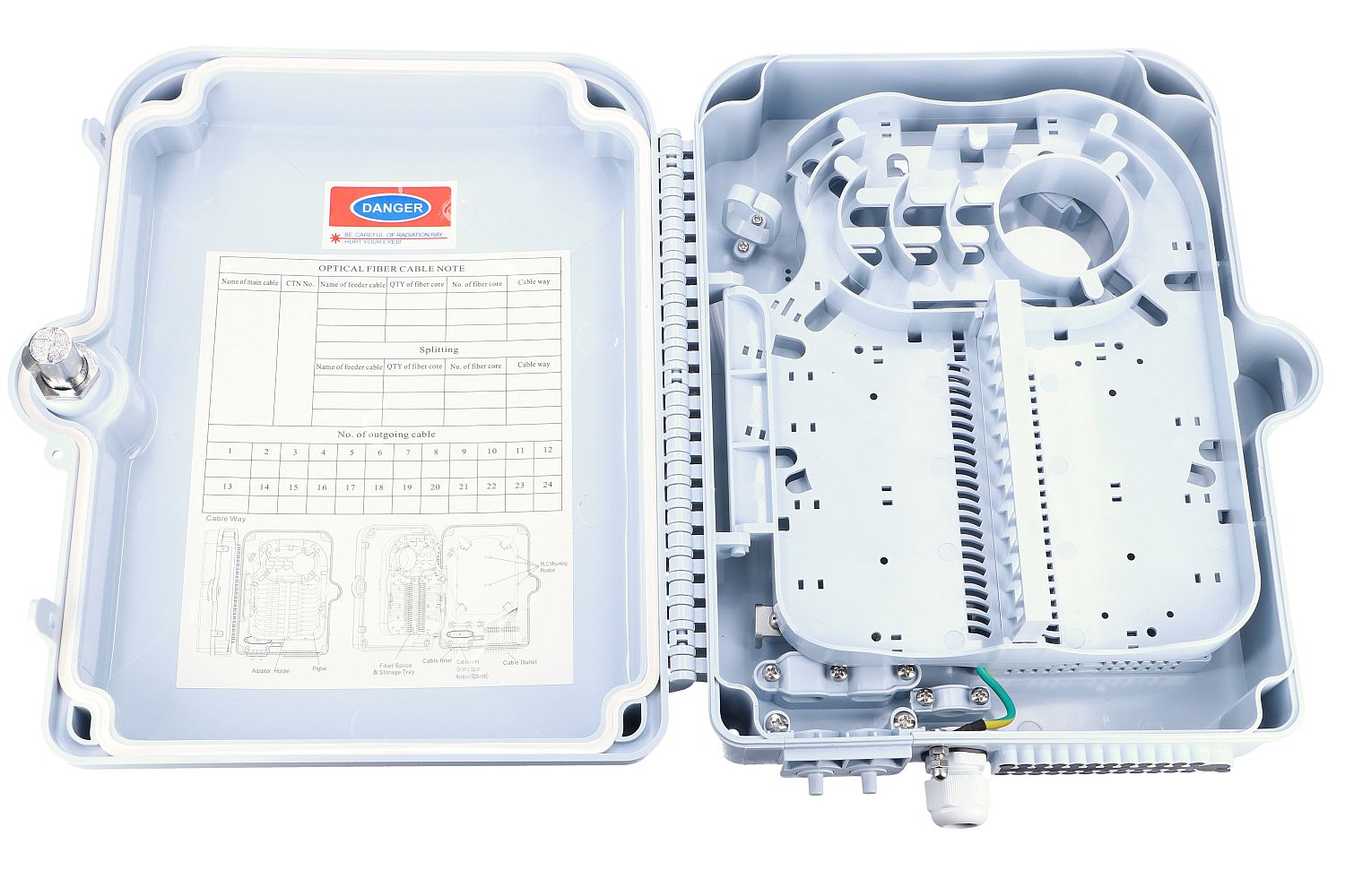 EXTRALINK FIONA 24 CORE serves as an end point of the power cable that connects to the drop cable in the FTTx communication network system. The fiber optic box can be used for fiber linking, splitting and distribution. It also provides solid protection and gives the possibility to manage the FTTx network building.