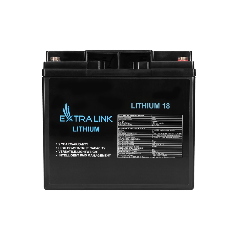 Extralink LiFePO4 lithium-iron-phosphate batteries with a nominal capacity of 18Ah offer a whole range of advantages over traditional battery-based solutions made with other technologies. Extralink LiFePO4 means longer life, no maintenance, remarkable safety, lightweight, improved discharge and charging efficiency. LiFePO4 batteries, due to their long life and zero maintenance, are the best investment for years to come.