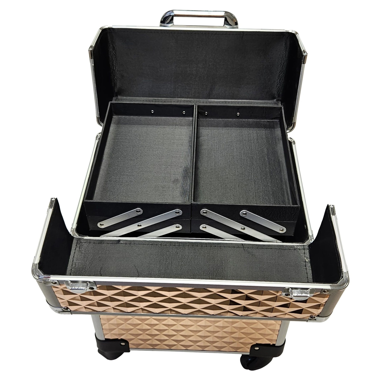 This trunk is a true master of organization. With its numerous divided sections and compartments, it will easily accommodate not only cosmetics, but also jewelry or hair accessories. Thoughtful layout of the interior guarantees easy access to every product, no matter how diverse your needs are. This trunk is a practical and reliable tool that will ensure perfect order.