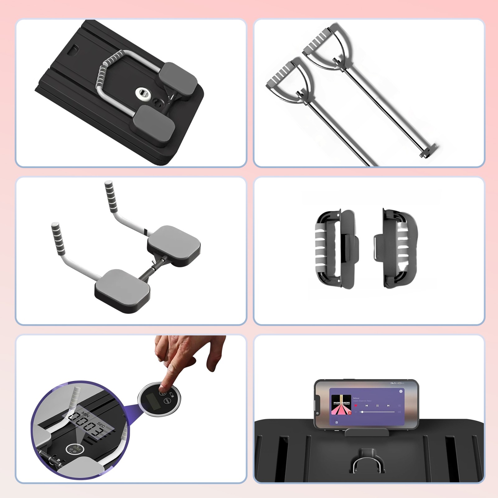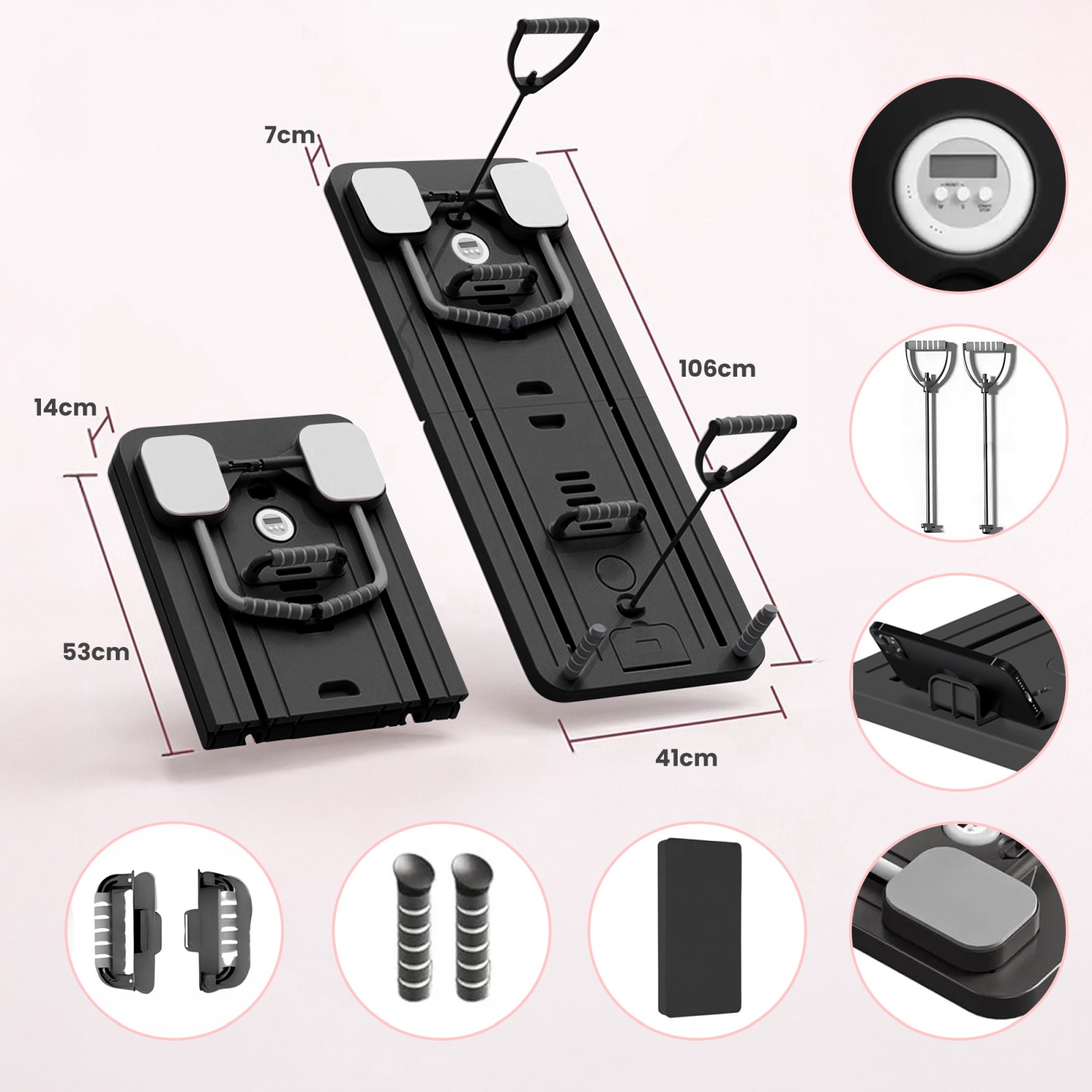 The product has a built-in timer that helps control exercise time and monitor progress. The set is enhanced with resistance bands and push-up handles, which expands the range of workout options. An additional phone holder means you can train with your favorite music or track your workout plans.