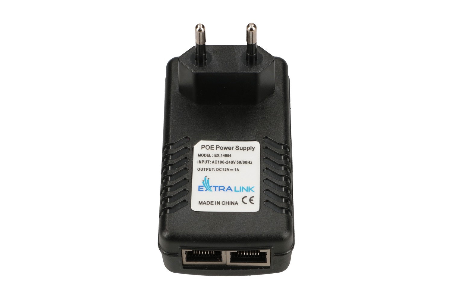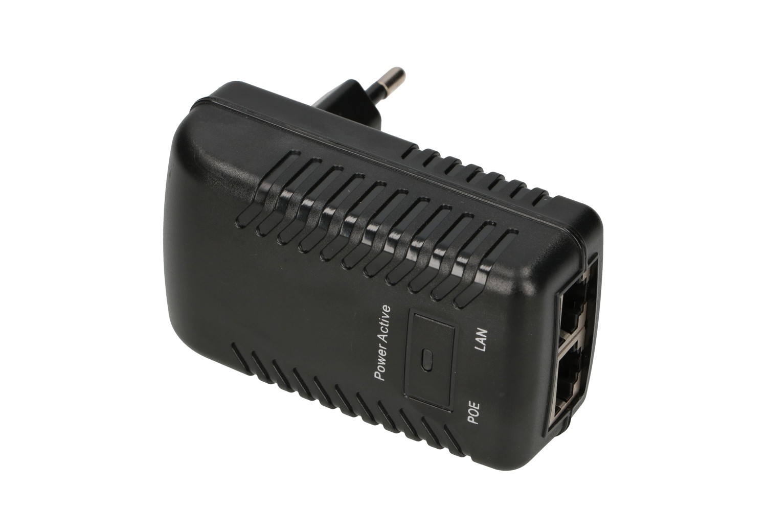 The power supply with two RJ45 ports has a form of over-the-air socket. To one is connected the device to be powered, and the other socket is used to connect via patchcord a switch or router.