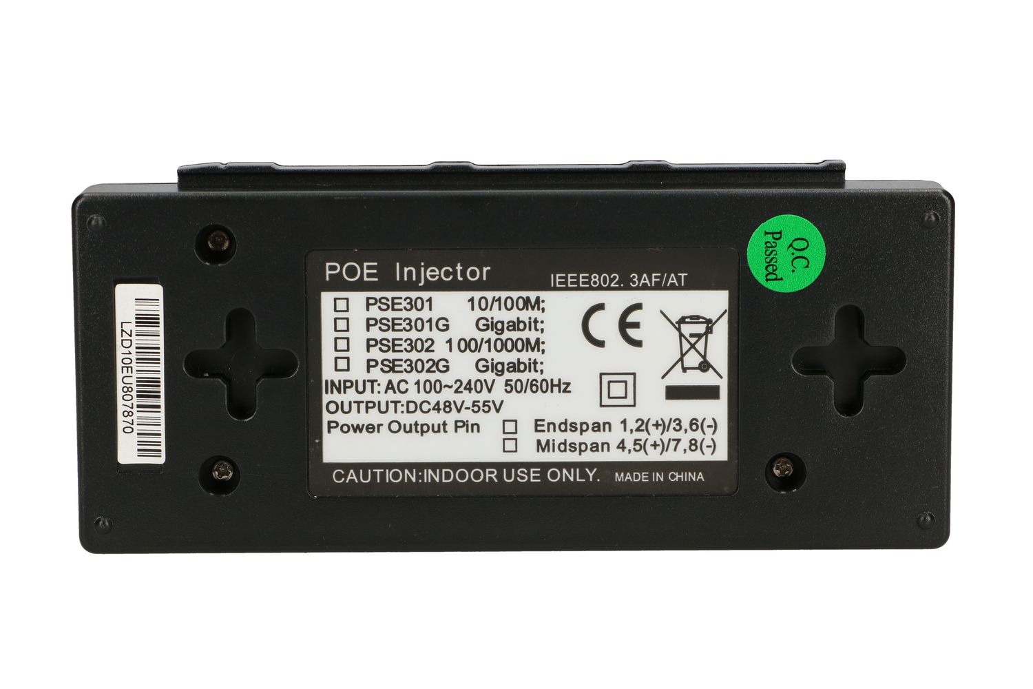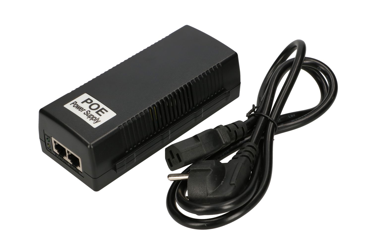 The power supply is equipped with a 1.2-meter-long power cable terminated with a cloverleaf connector and two RJ45 ports, one is used to connect the device to be powered, and the other socket is used to connect a patchcord to a switch or router.