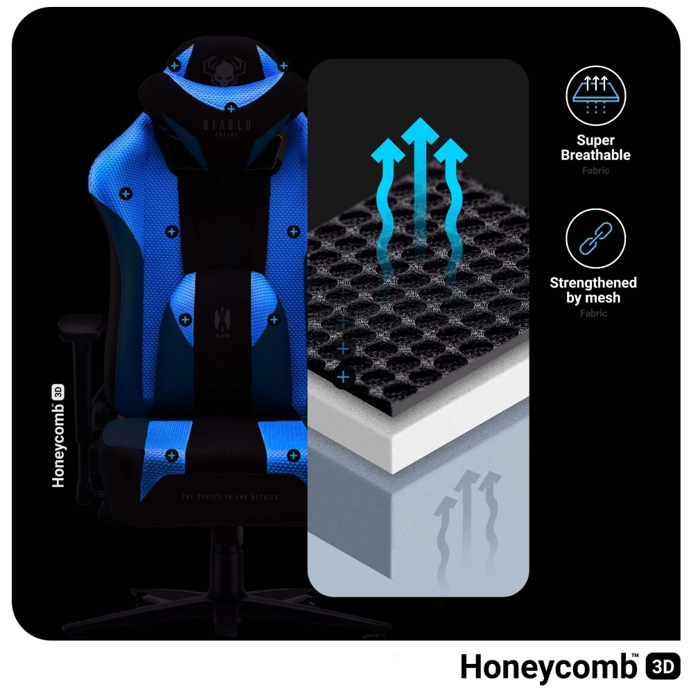 The ergonomic design supports proper posture thanks to a contoured backrest, headrest, and lumbar cushion, helping to reduce back and neck strain even during long sessions. The comfortable, wide seat with a layer of HR foam provides soft yet stable support, while high-quality EcoFiber™ fabric combined with breathable Diablo Honeycomb™ mesh ensures proper airflow and long-lasting upholstery.