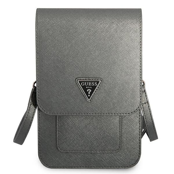 The branded smartphone bag is made of ecological leather with a luxurious Saffiano texture, closed with a magnetic clip, finished with a triangular Guess logo. It has a detachable shoulder strap, four pockets for cards/documents and two compartments for a smartphone.