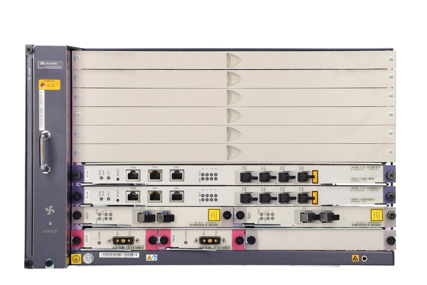 The Huawei MA5683T is a modular optical line terminal (OLT) that can support up to 12,000 subscribers (GPON). The device has a GICF uplink card. The modular optical line terminal (OLT) has 13 slots:
