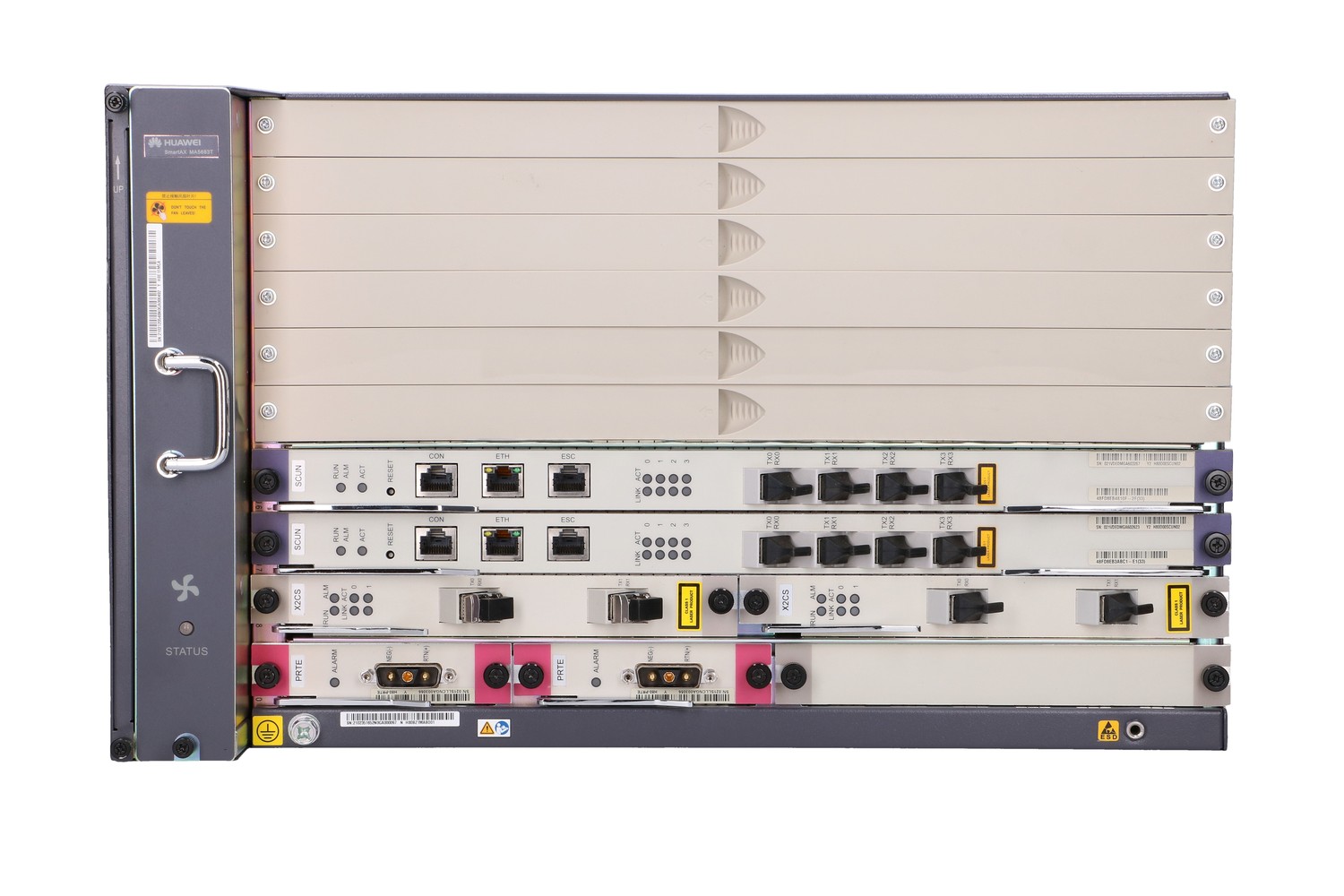 - 2 SCUN (Super Control Unit) control boards: Form the core of the control unit, they are responsible for system management, service switching and data aggregation. They also act as a management unit within the integrated NMS.