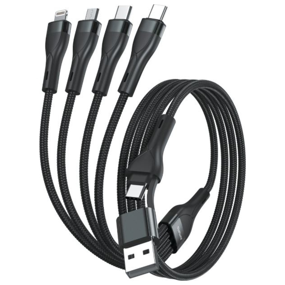 Uniwersalny kabel ładujący 4w2: Dzięki zintegrowanemu adapterowi pasuje do wszystkich popularnych smartfonów Apple i Android, a także innych akcesoriów mobilnych Jednoczesne ładowanie: Ładuj do czterech urządzeń jednocześnie. Dostępne są 2 porty USB-C, jeden port Micro-USB i jeden port Lightning, co zapewnia elastyczną łączność Jakość: Osłona kabla wykonana z wytrzymałego nylonowego oplotu, wysokiej jakości aluminiowe wtyczki i zabezpieczenie przed zagięciami na wszystkich końcach sprawiają, że Twój kabel jest wyjątkowo wytrzymały Złącza przyjazne dla etui: Cienkie końcówki kabli można podłączyć bezpośrednio do telefonu. Podłącz bez zdejmowania etui ochronnego ze smartfona