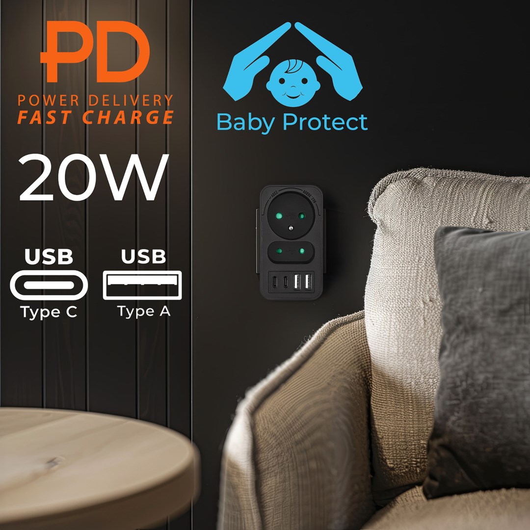 Maclean current socket x2 + 4xUSB splitter with 2 sockets 2xUSB A 2xUSB C PD 20W 1x16A + 1x6A MCE249 F/B