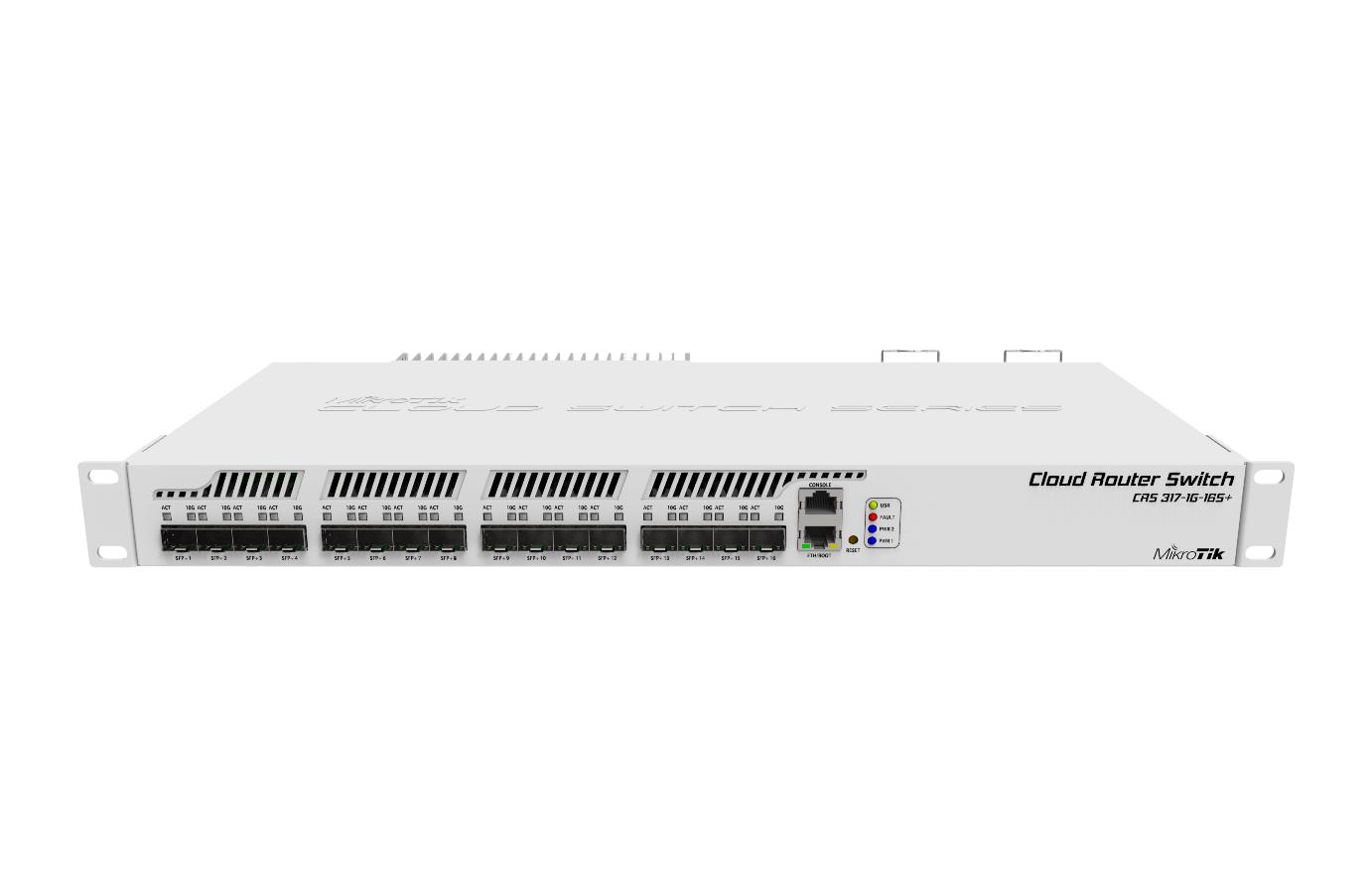 Cloud Router Switch 317-1G-16S+RM is a rack-mounted switch with Layer 3 functions, has 16 SFP+ ports for high performance 10GbE connections and a 1GbE copper port for management. In our shop you will also find: poe switches, mounting brackets, fiber optic cables and accessories, client devices, media converters, sfp modules, extraction brackets, power strips and others.