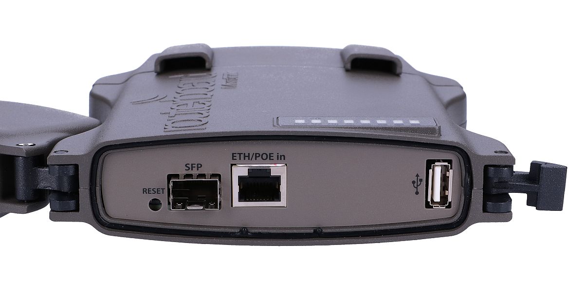 RTB-RB922UAGS-5HPacD-NM is equipped with 5GHz QCA9882 radio module, which works in 802.11ac standard. The board also has one Gigabit Ethernet port, which allows you to take full advantage of the 2×2 MIMO 802.11ac wireless network. CPU used in NetMetal 5 is QCA9557 720MHz CPU, with 128MB RAM. The device is also equipped with USB 2.0 port, SFP slot and miniPCI-e slot, to which you can connect an additional radio card.