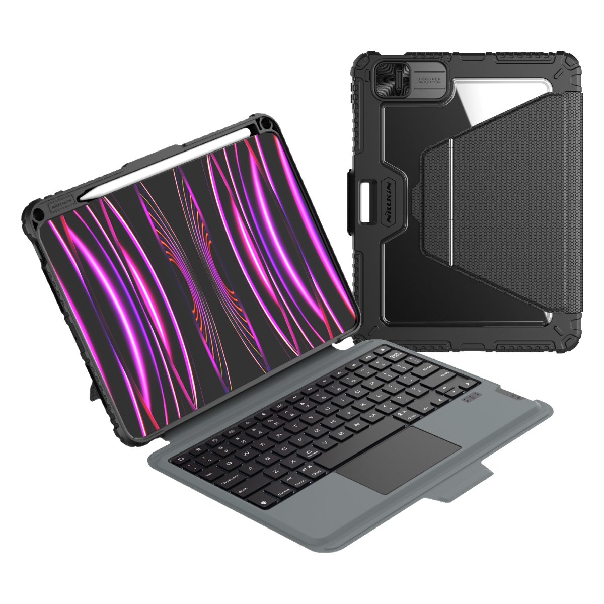 Nillkin Bumper Link Keyboard Case je víceúčelový ochranný kryt tabletu s odnímatelnou podsvícenou klávesnicí, slotem pro Apple Pencil a plynule nastavitelným úhlem tabletu.