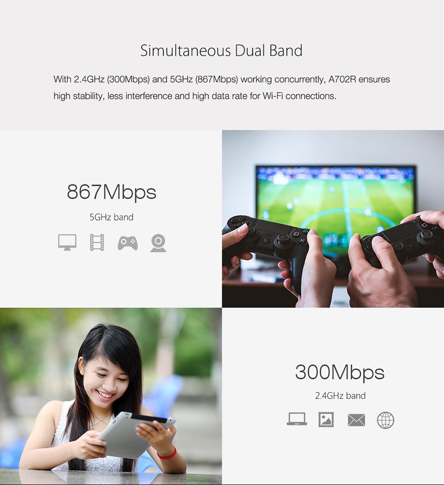 With simultaneous operation in the 2.4GHz and 5GHz bands, the A702R provides high stability, less interference and high data transfer rates for Wi-Fi networks.