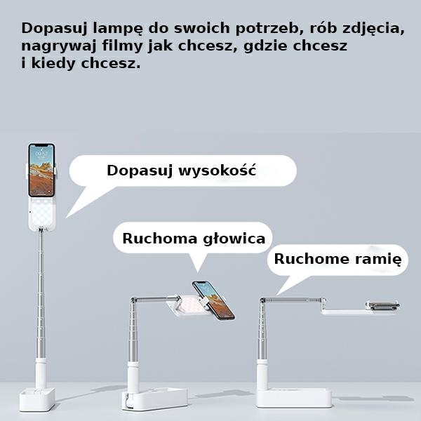 Rewelacyjny, multifunkcyjny stand z oświetleniem LED firmy USAMS US-ZB209.Materiał: stop aluminium + ABS + PCRozmiar: 210*80*63mmWaga: około 1116gWysokość rozciągania: 40-126 cmWejście: 5V (0.2A)Pojemność baterii światła wypełniającego: 1000 mAh;Czas korzystania z sieci bezprzewodowej: 3-12 godzinPojemność baterii pilota zdalnego sterowania: 50 mAh;Odległość połączenia BT: ?10 metrówObowiązująca szerokość telefonu: 50mm ~ 82mmFunkcje:1. Pokaz na żywo 3 w 1/łatwe robienie zdjęć/bezprzewodowy pilot zdalnego sterowania.2. Dwustronne światło wypełniające, regulowana temperatura barwowa/jasność.3. 8 części rozciąganych na wysokość do 126 cm, obrót o 360 °, możliwość ostawienia ostatniej części pod kątem 45°.4. Pojemność baterii 1000 mAh, długi czas użytkowania.5. Przenośna i wygodna.