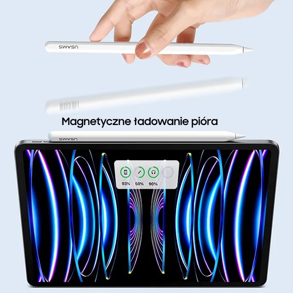 When paired with an iPad tablet, the device charges wirelessly through magnetic attachment to the tablet. The battery status can be easily monitored on the iPad screen – simply check the battery widget. The displayed battery level shows the status in real time.