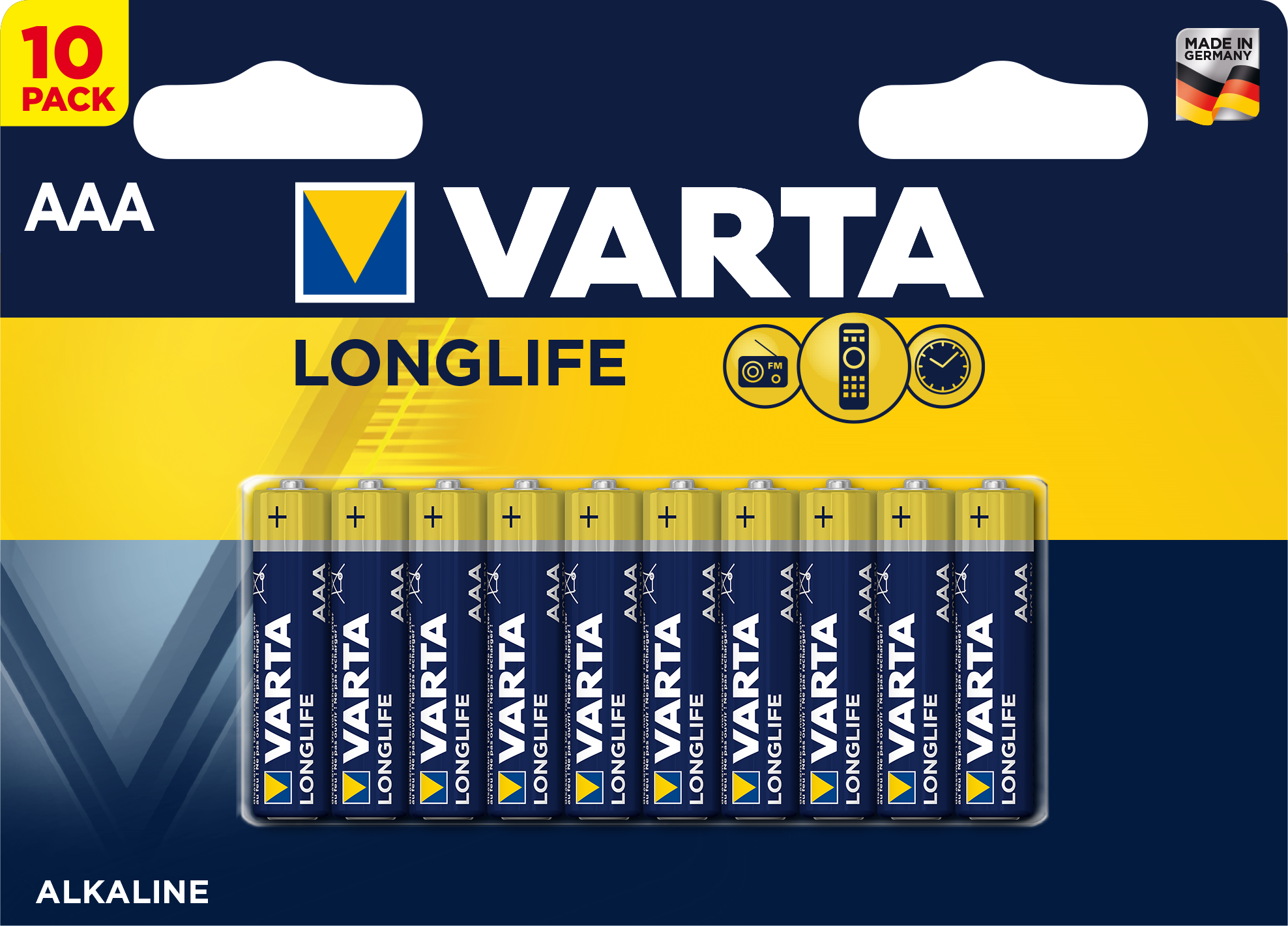 Sada alkalických baterií Varta Longlife Extra AAA pro přístroje s konstantně nízkou spotřebou energie jako jsou dálkové ovladače, nástěnné hodiny a rádio přehrávače apod.