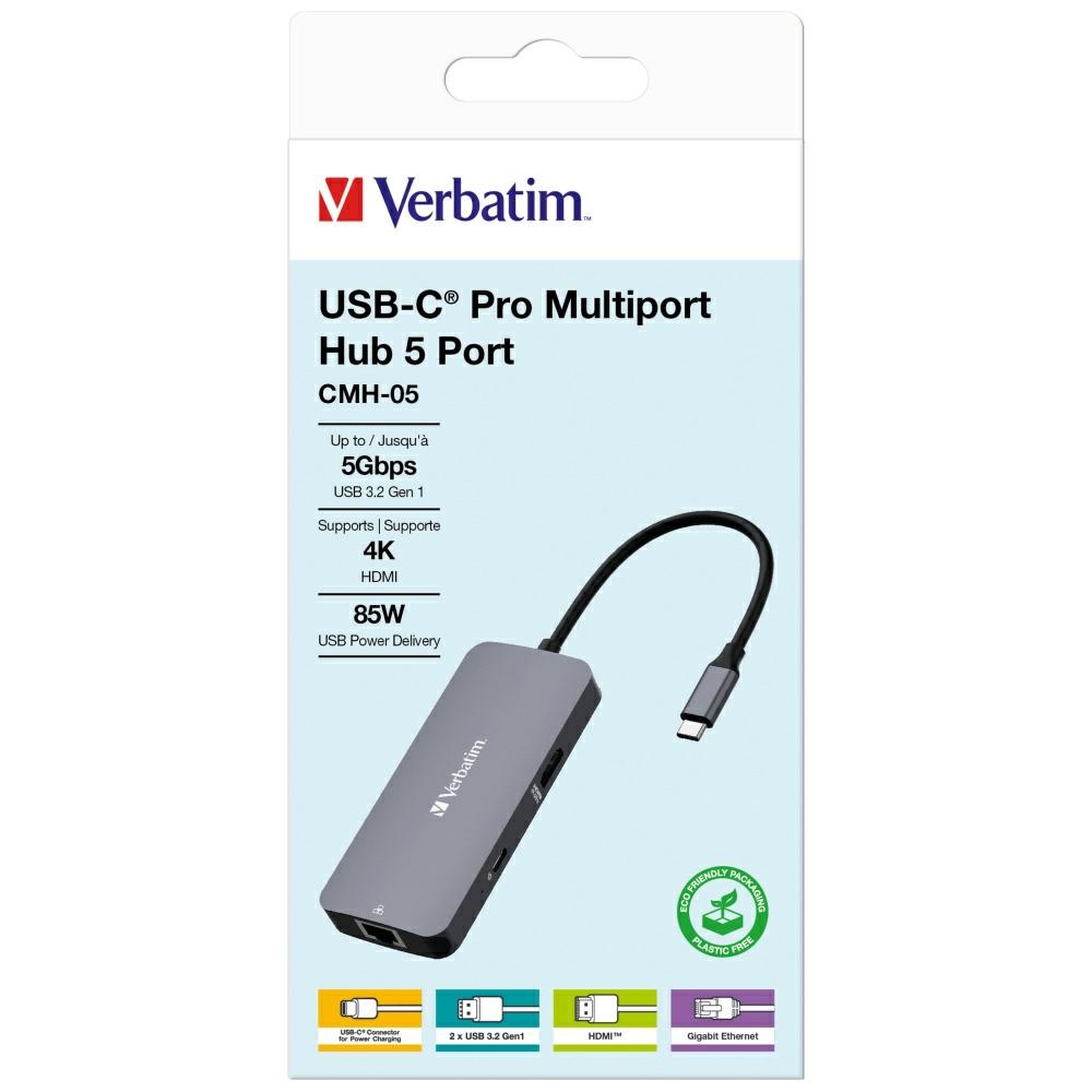 The Verbatim adapter is the perfect solution for those who want to increase the functionality of their laptop. This multi-port adapter transforms one USB-C port into five versatile ports, offering an HDMI port, a Gigabit Ethernet port, two USB-A ports, and a USB-C PD port for pass-through charging.