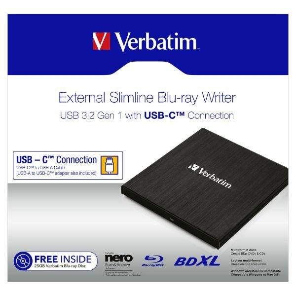 External Blu-ray Slimline recorder with USB-C™ connection. USB-C™/USB-A cable (with USB-A/USB-C™ adapter included). USB 3.2 GEN 1. Compact and lightweight, ideal for notebook and ultrabook. Powered by USB port — no bulky power adapter. Nero Burn & Archive software included. Capacity up to 100 GB on BDXL disc / 8.5 GB on dual-layer DVD / 4.7 GB on standard DVD. Fully compatible with M-DISC archival technology. Includes FREE Verbatim Blu-ray disc with 25 GB capacity.