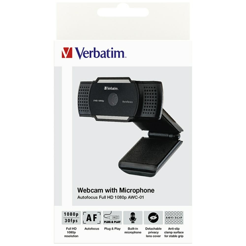 | Package Contents | • Verbatim AWC-01 Webcam with Full HD quality, autofocus, and microphone • USB 2.0 micro USB to USB-A cable • Quick Start Guide • Includes removable privacy lens cover |