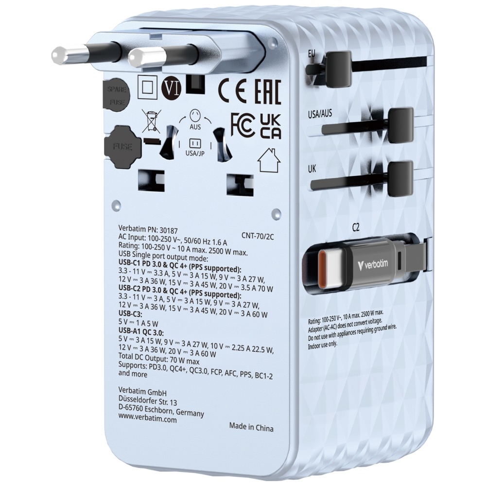 Verbatim Travel Adapter EU/UK/US GaN 1xUSB-C/1xUSB-A/2xUSB-C PD 70W blue 30187