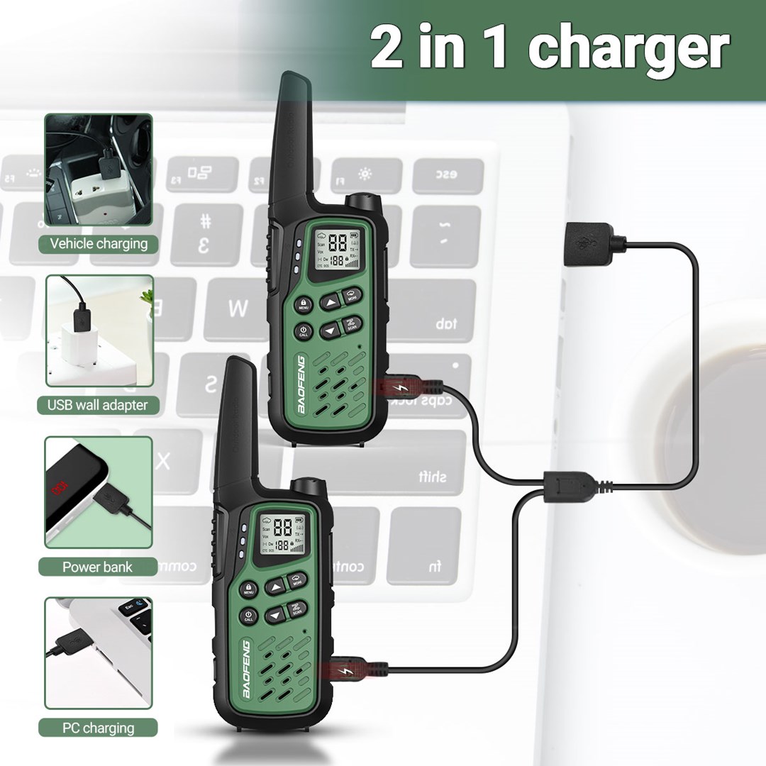 2x PMR Radio Baofeng BF-T25,2x 3,7V 1400mAh battery, 2x PTT-1,1x AC adapter (EU) 230V/USB, 1x USB charging cable, 2x lanyard |